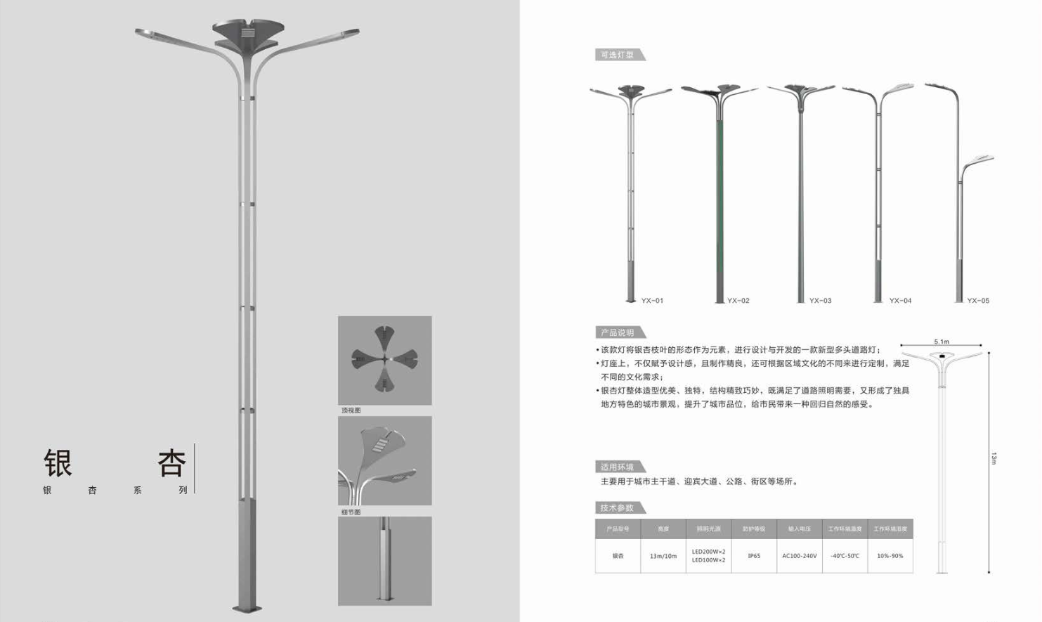 1、高度為6-16米; 2、花葉光源為4組LED光源,色溫2500-6500K,每個光源功率為60-300W; 3、LED驅動電源壽命可達五年; 4、整體熱鍍鋅噴塑,保證燈桿15年不生銹; 5、可以根據使用地區的地域文化、產業特點等進行文化定制;
